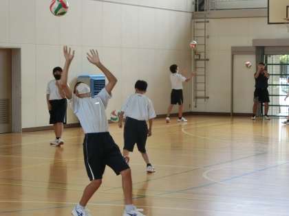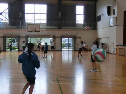 バレーボールのパス練習に取り組んでいました。ペアになり、アンダーハンドやオーバーハンドのパスを技術を習得しようと努力しています。現在はまだまだ10回を超えるペアはごくわずかですが、失敗を気にせず、仲間と明るく活動している姿が印象的でした。しっかり練習してゲームを楽しんでほしいと思います。