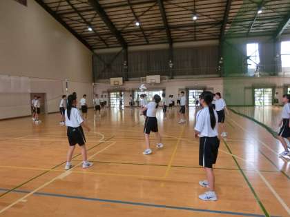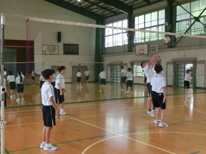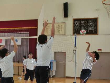 バレーボールのゲームが行われていました。チームは男女別ですが、対戦は性別を問わずに行います。まだまだ始まったばかりの単元ですが、体育館中が元気な声と熱気に包まれていました。