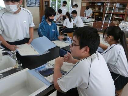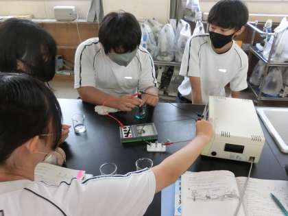 「どのような水溶液に電流が流れるのだろうか?」をテーマに実験に取り組んでいました。精製水・食塩水・砂糖水・塩酸・エタノール・水酸化ナトリウム・塩化銅など、多くの水溶液が用意され、そのすべてを確かめていきます。実験結果をノートにまとめるのもひと苦労のようでしたが、仲間と協力して学習が進められていました。