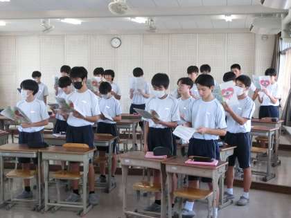 合唱コンクールに向けての歌練習に取り組んでいました。パートリーダーが中心となっての各パートでの練習、指揮者と伴奏者の息を合わせる練習、そして全体でのハーモニーの確認…。自分たちで建設的な意見を出し合いながら、時間いっぱいしっかりと練習していました。
