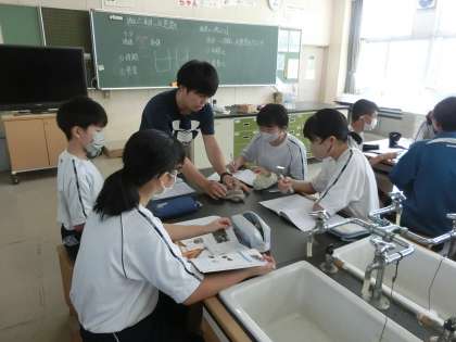 「固体⇔液体で変化するものは?」をテーマに、ロウを使って体積や質量の違いを確かめる実験が行われていました。器具を安全に使い、実験も手順通りにしっかり進めていきます。グループ内で感じたことをどんどん伝え合っている姿が印象的でした。