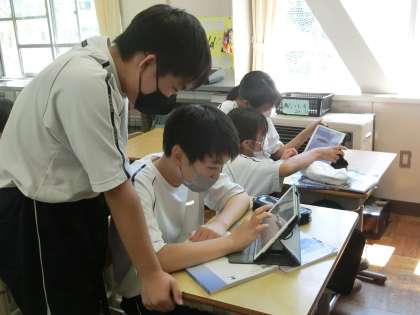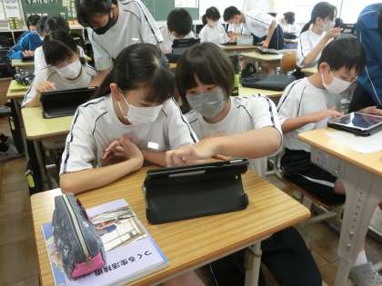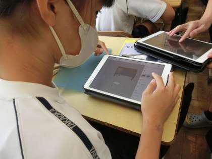 学習用タブレットでリアリティ・コンポーザーというアプリを使って、画面上に立体図形を組み立てていきます。まずは教室の前方にある教卓を作図していきます。これができると「デザイナー」。この称号を手に入れると、机やいすの作図でクリアすると「職人」。そして最後は自分の好きな物の形の作図が完成すると「人間国宝」の称号を手にすることができます。