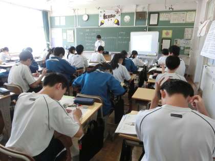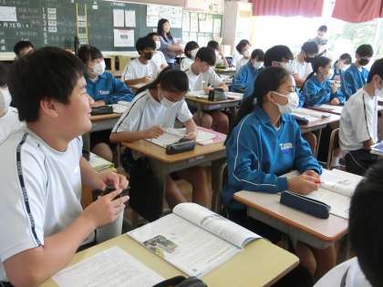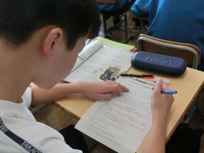 「原爆について向き合う」という内容の英文の物語を読み込んでいました。内容を読みtるためには、これまでの学習してきたことを思い出しつつ、新出語句にも対応していかなければなりません。教科担任の説明を一生懸命聞いていました。