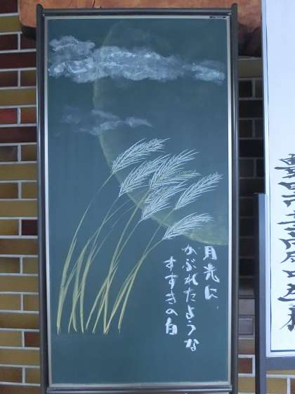 正面玄関のウェルカムボードのイラストが変わりました。秋を思わせる月夜とススキが描かれています。