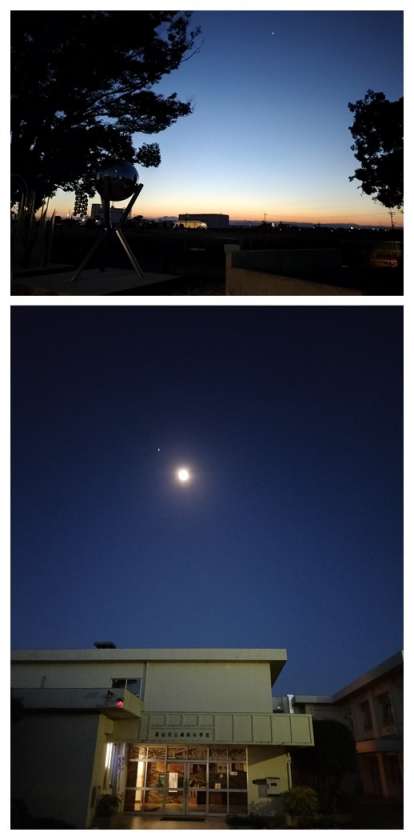 (写真下段は、日の出後の現在の様子です。空に見える白い点が月です)