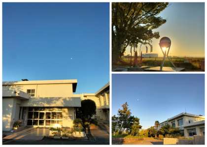 間もなく日の出を迎える時間、学校から見た東の空は、濃い青色の夜の雰囲気とオレンジ色の朝を迎える雰囲気とがきれいにグラデーションになっていて、とても幻想的です(写真上段・上)。また、同じ時間に西の空を見ると、月が輝いていました(写真上段・下)。