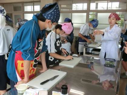 今日は調理室での実習。テーマは「きゅうりを安全に切ろう!」です。7種類の切り方を10分という制限時間内に行い、その出来栄えや手際の良さ、もちろん安全面も確認していきます。ペアになり、タブレットでお互いの活動の様子も記録していきます。ぎこちない手つきの生徒もいましたが、制限時間もしっかり守り、きゅうりの7種切りを完成させていました。