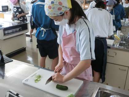 今日は調理室での実習。テーマは「きゅうりを安全に切ろう!」です。7種類の切り方を10分という制限時間内に行い、その出来栄えや手際の良さ、もちろん安全面も確認していきます。ペアになり、タブレットでお互いの活動の様子も記録していきます。ぎこちない手つきの生徒もいましたが、制限時間もしっかり守り、きゅうりの7種切りを完成させていました。