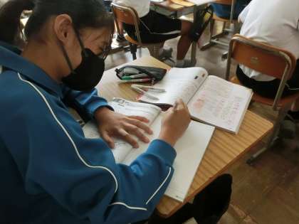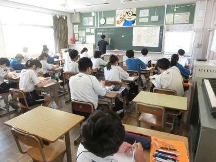 「動物の体のしくみとはたらき」の単元で、「消化酵素のはたらきをまとめよう!」をテーマに学習が進められていました。新たな重要語句がどんどん飛び出します。確実に理解しようと、一生懸命授業に臨む姿が印象的でした。