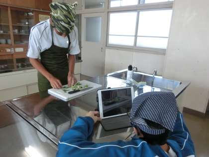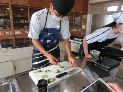 今日は調理室での実習。テーマは「きゅうりを安全に切ろう!」です。7種類の切り方を10分という制限時間内に行い、その出来栄えや手際の良さ、もちろん安全面も確認していきます。ペアになり、タブレットでお互いの活動の様子も記録していきます。ぎこちない手つきの生徒もいましたが、制限時間もしっかり守り、きゅうりの7種切りを完成させていました。