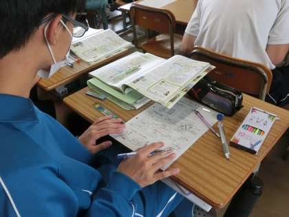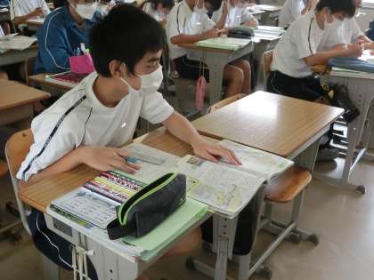 「中国・四国を知ろう」をテーマに学習が進められていました。まずは該当する県、地形や気候など、基礎内容を確認していきます。地図や教科書などの図やグラフをしっかり読み込んでいる生徒の姿が印象的でした。