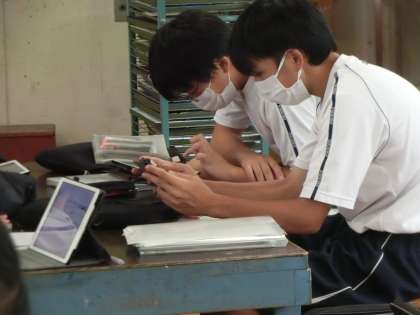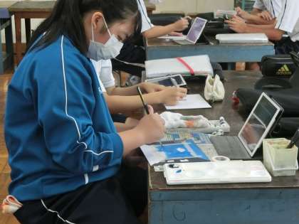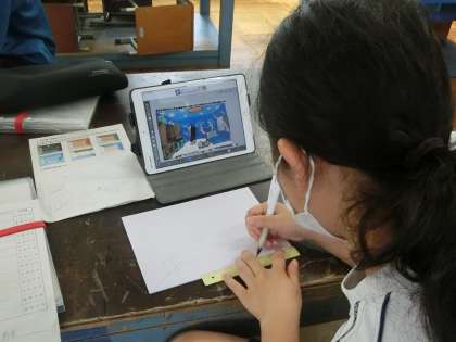空想画の作品づくりの学習で、タブレットを駆使して決めた配色に従って、いよいよ完成の形が見えてきました。そのため、最後の工程である色付けには、細心の注意を払って取り組んでいました。