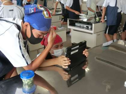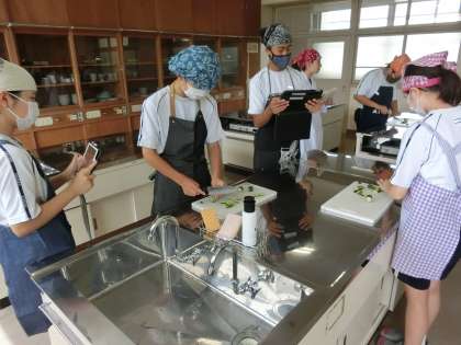 今日は調理室での実習。テーマは「きゅうりを安全に切ろう!」です。7種類の切り方を制限時間(10分)内に行い、その出来栄えや手際の良さ、もちろん安全面も確認していきます。ペアになり、タブレットでお互いの活動の様子も記録していきます。ぎこちない手つきの生徒もいましたが、制限時間もしっかり守り、きゅうりの7種切りを完成させていました。