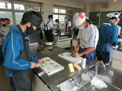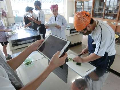 今日は調理室での実習。テーマは「きゅうりを安全に切ろう!」です。7種類の切り方を制限時間(10分)内に行い、その出来栄えや手際の良さ、もちろん安全面も確認していきます。ペアになり、タブレットでお互いの活動の様子も記録していきます。ぎこちない手つきの生徒もいましたが、制限時間もしっかり守り、きゅうりの7種切りを完成させていました。