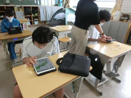 学習用タブレットのアプリ・地図パズルを使って、都道府県の位置や形を学んでいました。地方ごとに分かれたバージョンだったり、日本全国を一気に解くバージョンだったり、白地図やグーグルマップのような写真タイプのものもあります。全員が黙々と取り組んでいる姿に感心しました。