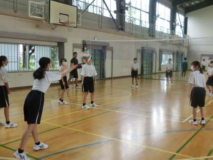 バレーボールの学習で、これまで基本の技能の習得のために活動してきました。今回からはゲームを進めていくにあたって、ローテーションの仕方やチーム内での作戦に重きを置いた活動にレベルアップしていました。