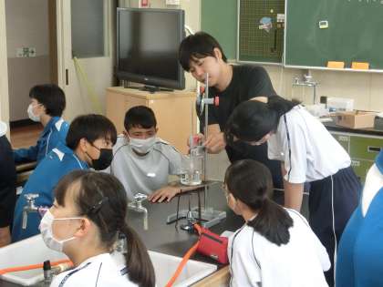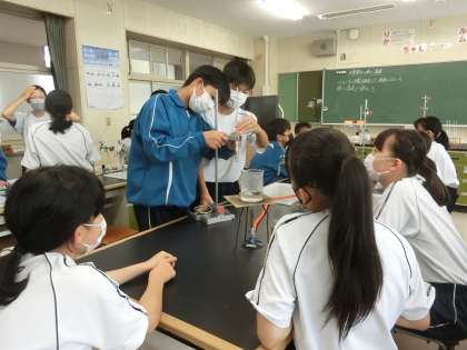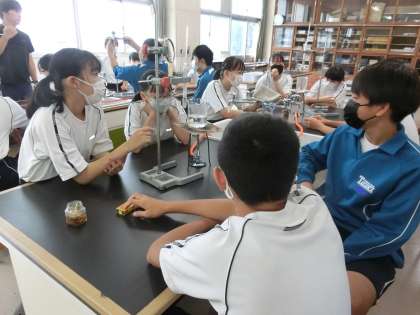 「状態変化の時の温度」を調べる実験に取り組んでいました。固体(パルミチン酸)を加熱して液体に変化してく時の温度との関係をまとめていきます。次第に実験も手順が複雑になりつつあります。しっかりと注意事項を守って、安全に実験を進めていきたいと思います。
