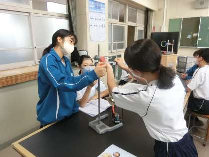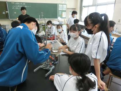 「状態変化の時の温度」を調べる実験に取り組んでいました。固体(パルミチン酸)を加熱して液体に変化してく時の温度との関係をまとめていきます。次第に実験も手順が複雑になりつつあります。しっかりと注意事項を守って、安全に実験を進めていきたいと思います。