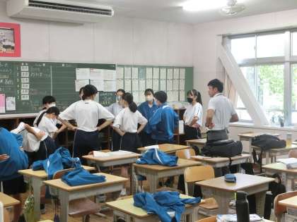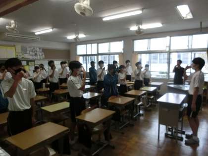 音楽の授業で習った姿勢や息継ぎなどのトレーニングを繰り返しているクラスもあります(写真では、背伸びをしたり、お辞儀をしているものがこのトレーニングです)。また、パート練習に取り組むクラスもあります。