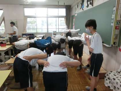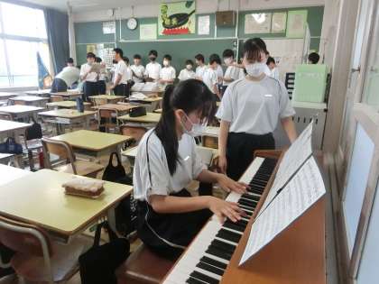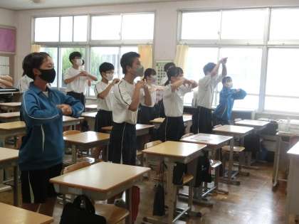 音楽の授業で習った姿勢や息継ぎなどのトレーニングを繰り返しているクラスもあります(写真では、背伸びをしたり、お辞儀をしているものがこのトレーニングです)。また、パート練習に取り組むクラスもあります。