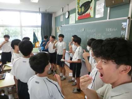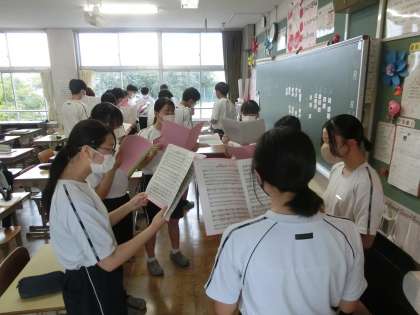 音楽の授業で習った姿勢や息継ぎなどのトレーニングを繰り返しているクラスもあります(写真では、背伸びをしたり、お辞儀をしているものがこのトレーニングです)。また、パート練習に取り組むクラスもあります。
