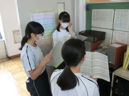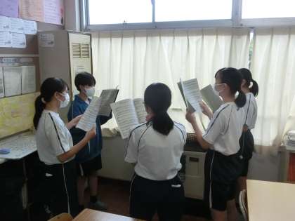 音楽の授業で習った姿勢や息継ぎなどのトレーニングを繰り返しているクラスもあります(写真では、背伸びをしたり、お辞儀をしているものがこのトレーニングです)。また、パート練習に取り組むクラスもあります。