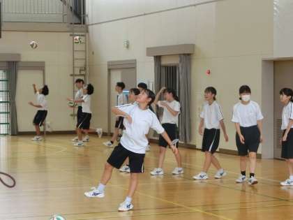 バレーボールの学習で、今日はゲーム前にサーブの練習に取り組んでいました。相手コートに正確に入るよう、試行錯誤しながら何度も挑戦していました。