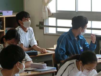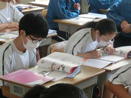 教科書の本文のリーディングが行われていました。どの分が当たるか分からないため、仲間と読み合いをしています。いよいよピリオド読みがスタートし、順番を待つ生徒は指先で文をなぞっていくほどです。