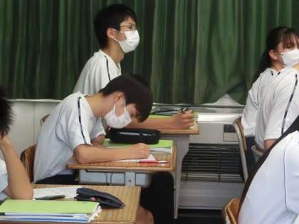 教科書に示されている内容を答えるプリントが用意されています。内容や文法に注意しながら、正しい答えを導き出していました。
