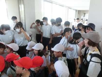 到着後すぐに1年生の授業の様子を参観し、放課になると3年生のフロアへ。授業を終えて廊下に出てきた3年生が笑顔で出迎え、グータッチをしたり、質問に答えたりするなどのプチ交流会が始まりました。秋には保育実習を控ええいる3年生たちにとって、予行練習になったかもしれません。