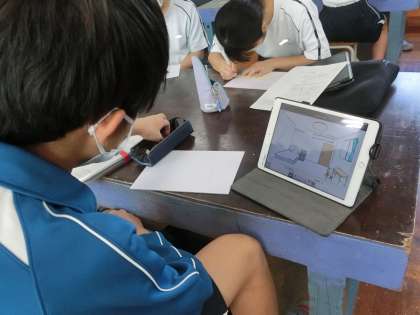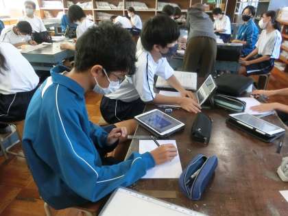 「理想の空間デザイン」の着色に取り組んでいました。タブレットで考えた配色をもとに、色づくりから塗る活動まで、丁寧に進めていました。