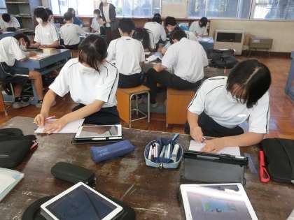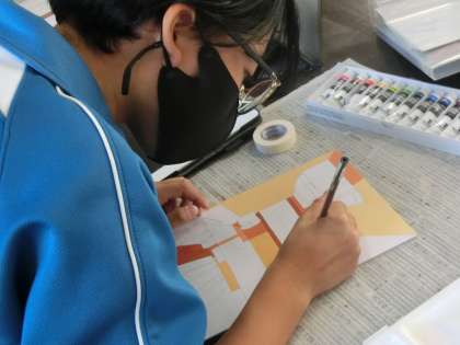 9/27 作品づくり 3 公開日 2023/09/27 更新日 2023/09/27 各学年から 2年4組の美術の授業の様子です。 「理想の空間デザイン」の着色に取り組んでいました。タブレットで考えた配色をもとに、色づくりから塗る活動まで、丁寧に進めていました。