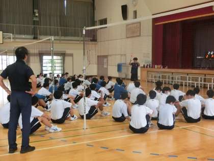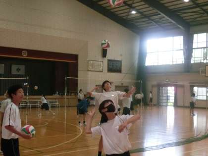 バレーボールの学習で三段攻撃の練習とゲームが行われていました。仲間とつないで取った1点は、喜びも大きいようです。