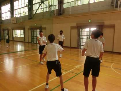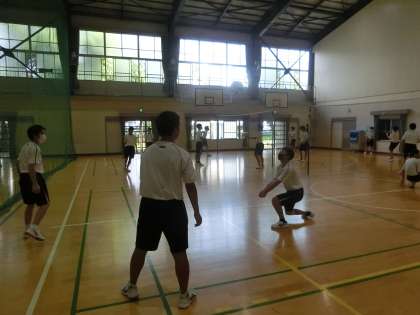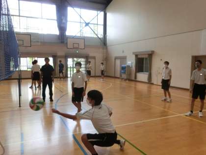 バレーボールの学習で三段攻撃の練習とゲームが行われていました。仲間とつないで取った1点は、喜びも大きいようです。