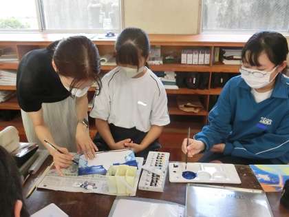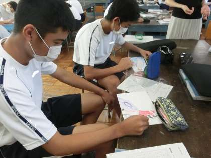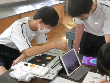 仲間のアドバイスやアイデアもたくさん取り入れながら、最後の工程の着色に取り組んでいました。空想画のデザイン作品も間もなく完成です。