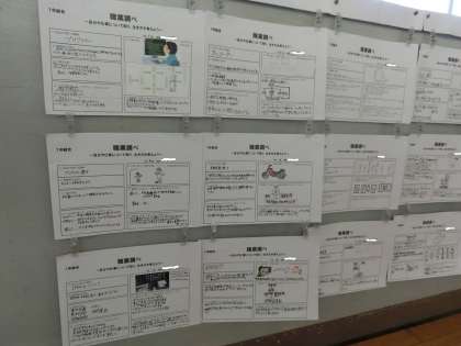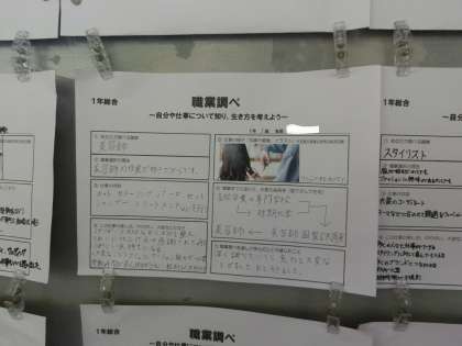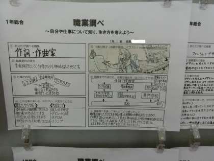 1年生の教室前の廊下には「職業調べ」のレポートが掲示されていました。これは、総合的な学習の中でも「キャリア学習」と言われるもので、将来就きたいと思っている職業や現在興味をもっている職業についてまとめたものです。