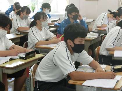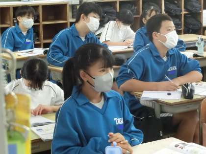 「沸点や融点の違いから考えよう」というテーマで学習が進められていました。難しい重要語句がたくさん黒板に書かれています。しっかりと意味を理解しながら覚えていってほしいと思います。