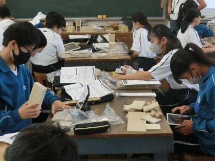 配付された材料から木製品の完成イメージを、立体設計図が作成できるアプリを使ったり、実際に木材を組み合わせたりして、自分が作りたい木製品のイメージを出し合っていました。いろいろなパターンやアイデアを出し合いながら、出来上がりを楽しみにしている生徒がたくさんいることが伝わってきました。