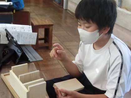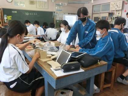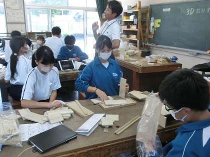 配付された材料から木製品の完成イメージを、立体設計図が作成できるアプリを使ったり、実際に木材を組み合わせたりして、自分が作りたい木製品のイメージを出し合っていました。いろいろなパターンやアイデアを出し合いながら、出来上がりを楽しみにしている生徒がたくさんいることが伝わってきました。