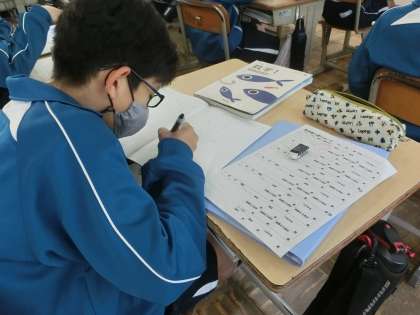方程式の計算で、「カッコ、分数 どうする?」をテーマに学習が進められていました。初めは解きやすい問題でしたが、次第に難易度が上がっていきます。いよいよ「計算が大変」「もう助けて…」と悲鳴が上がります。そこですかさず、教科担任から「仲間と相談してみよっか?」と救いの手が差し出されます。
