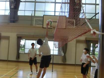 バレーボールの学習で、男女対抗のゲームが行われていました。最初のうちは女子に少し優しかった男子。でも点を取られ始めると、闘志のスイッチが入り、スパイクが炸裂することも。それでも女子は嫌がるどころか、負けじと楽しく戦います。