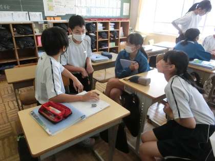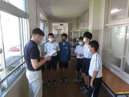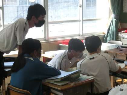 ALTとのコミュニケーションの授業でした。読まれる英文を聞き取ったり、日本語を英文に訳したりすることを、グループ対抗戦のゲーム感覚で行っていきます。ポイントを獲得しようとグループで楽しそうに活動している様子が印象的でした。