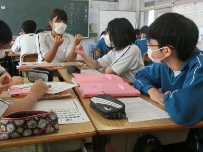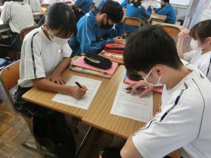 短歌づくりのパート2として、「短い文から短歌をつくってみよう」をテーマに活動が進められていました。グループになり、示された短い文を短歌に変換していきます。指を折り、文字数を確認しながら、仲間と最適な言葉を出し合っていました。