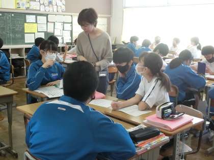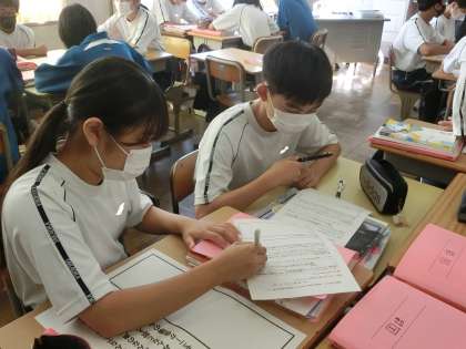 短歌づくりのパート2として、「短い文から短歌をつくってみよう」をテーマに活動が進められていました。グループになり、示された短い文を短歌に変換していきます。指を折り、文字数を確認しながら、仲間と最適な言葉を出し合っていました。