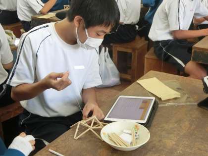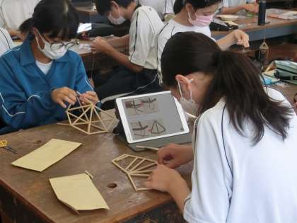 「ヒンメリ」をイメージしたLED照明の制作です。ストローと糸だけで立体的な形を作っていきます。そこでカギとなっているのが、立体設計図を描けるタブレットのアプリ。しっかりと完成品のイメージができ、制作活動を大いに助けてくれています。