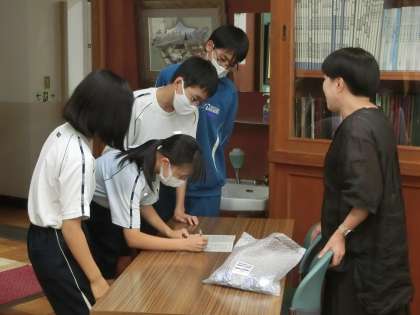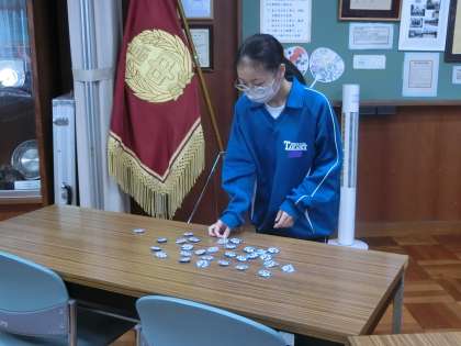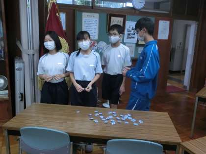 先日に引き続き、昨日は2年生に缶バッジが配付されました。これは、地域の行事などにボランティアで参加した生徒に配付されています。まさに「We Love たかおか」。