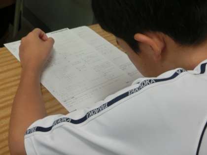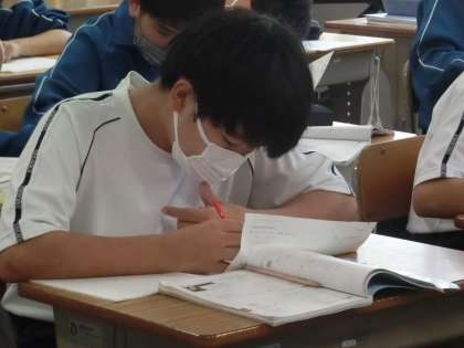 先日行われた単元テストが返却され、今回はその解き直しに取り組んでいました。理解が不十分だった問題はもちろん、正解している問題も計算ミスなく解けるかを確認していきます。こうした積み重ねを繰り返し、1か月後の定期テストでは期待通りの点数が取れるよう、頑張ってほしいと思います。