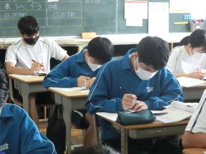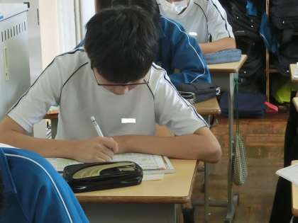 「公正な裁判を行うためのしくみ」について学んでいました。裁判所の種類やそれぞれで行われる裁判の内容などを学んだあと、演習問題に取り組み、学習した内容を確認していました。集中して学習に臨む姿が印象的でした。