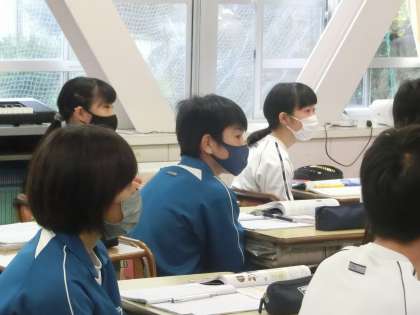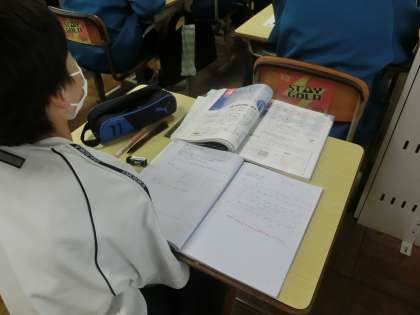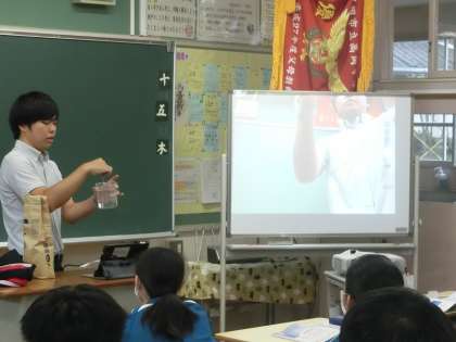 新しい単元「水溶液」について学習が進められていました。教科担任がビーカーの水の中に食塩を投入していきます。どのような状態になったら「溶けた」というのか、どこまで溶けるのかなどを大型モニターの映し出された映像で判断していきます。生で見る教科担任の手の動き、映像に映し出されるビーカーの中の様子、どちらも興味深げに見ていました。