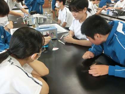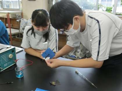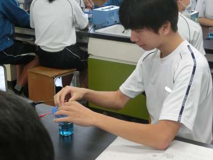 塩化銅水溶液の電気分解の実験が行われていました。今回は、「塩化銅水溶液中のイオンが電極で変化すること」を確認していきます。その後、化学反応式に表したり、どの電極で何が発生したか、発生した物質の性質などについても学習を深めていました。